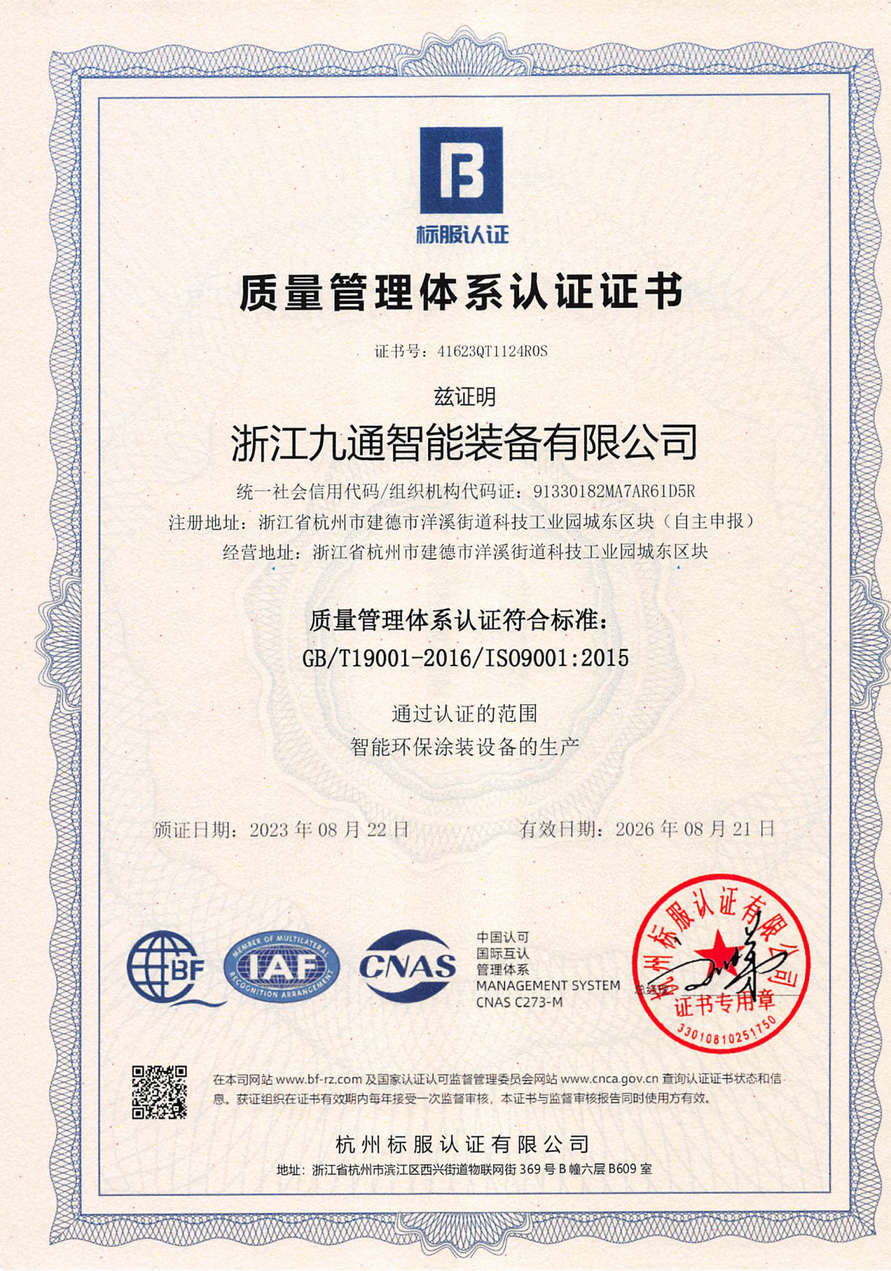 浙江九通智能裝備有限公司簡稱九通,由“譽滿九州 廣陌通衢”而來,成立于2011年,專注于智能環保涂裝整體解決方案系統,是一家集咨詢、勘察、設計、研發、生產、銷售、安裝、調試、交付、運維于一體的專業服務廠商,研發總部位于北京,生產基地設立于浙江、山東、廣東。產品包括涂裝生產線、噴砂房、噴漆房、涂裝機器人、烤漆房、噴漆烘干一體房、除塵設備、有機廢氣處理設備等,客戶群體包括風電、軌道交通、航空航天、專用車、汽車、結構件、石油裝備、工程機械、礦工機械等領域,項目經驗豐富!